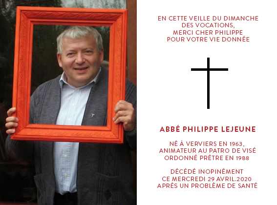 Prions pour l’abbé Philippe Lejeune, originaire de Visé, qui vient de nous quitter inopinément. En cette veille du dimanche des vocations, merci à vous Philippe pour votre vie donnée ! Reposez en paix. Union avec votre famille et tous vos amis de Visé, Vielsalm, Attert, Aywaille et du vicariat de la santé. Ce mercredi 29 avril, létat de santé de Philippe sétant dégradé depuis quelques jous, il a été décidé de lhospitaliser. Durant son transfert au CHU, il a été victime dun arrêt cardiaque et il a été impossible de le réanimer. Il est décédé un peu après 21h00. Il sera incinéré et ses cendres seront déposées au cimetière de Visé le mercredi 6 mai. Prions pour lui et sa famille, en particulier sa chère maman.