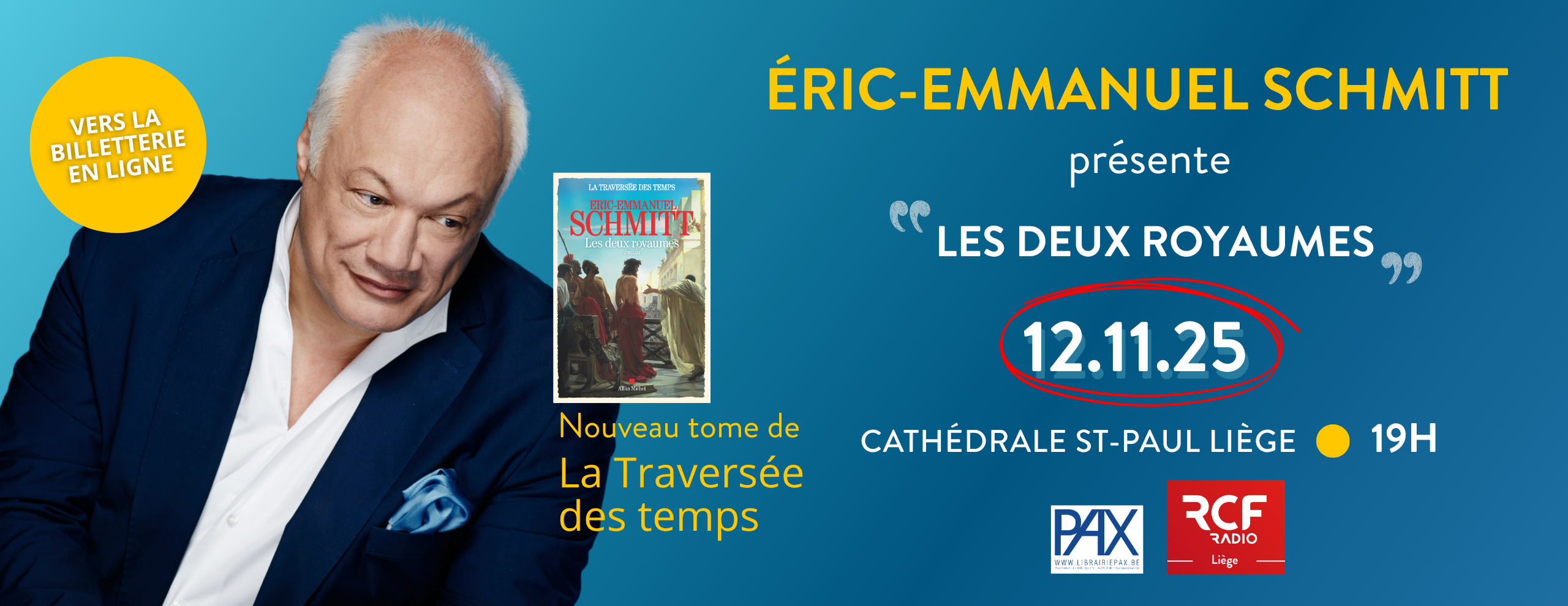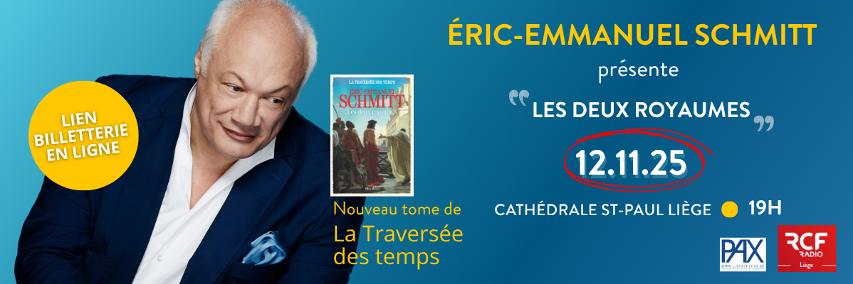Grande conférence avec Éric-Emmanuel Schmitt La conférence d’Eric-Emmanuel Schmitt, initialement prévue le jeudi 16 octobre à la Cathédrale Saint-Paul de Liège, est reportée au mercredi 12 novembre à 19h, même lieu, même horaire. Rassurez-vous : l’auteur se porte bien ! Ce report est simplement dû à un empêchement temporaire. 🎟️ Les billets déjà achetés restent […]